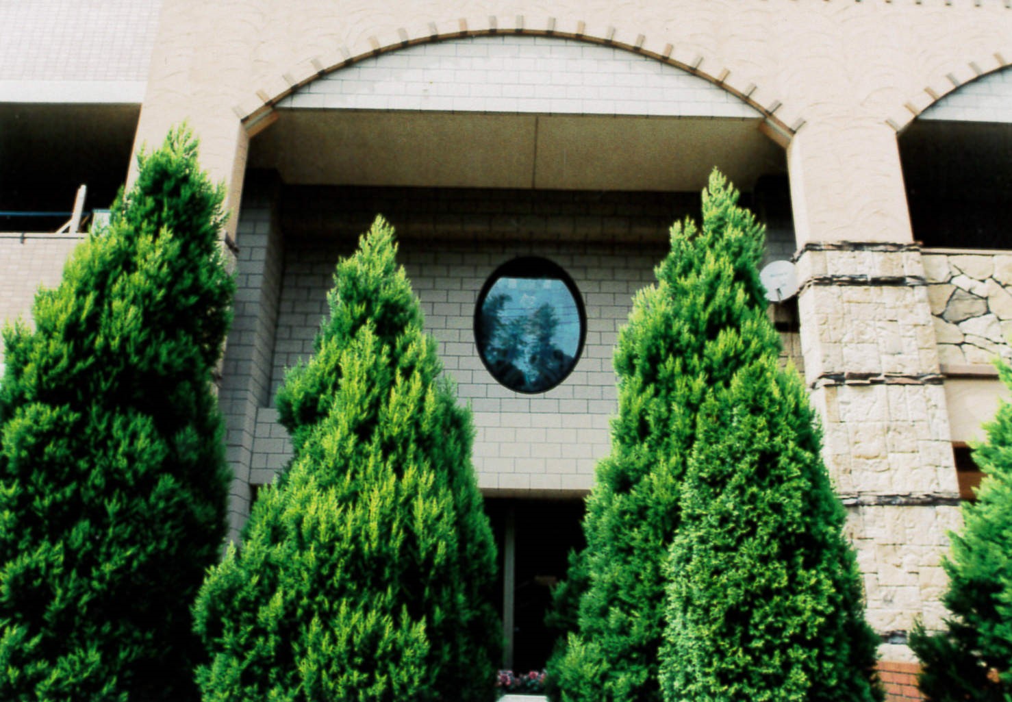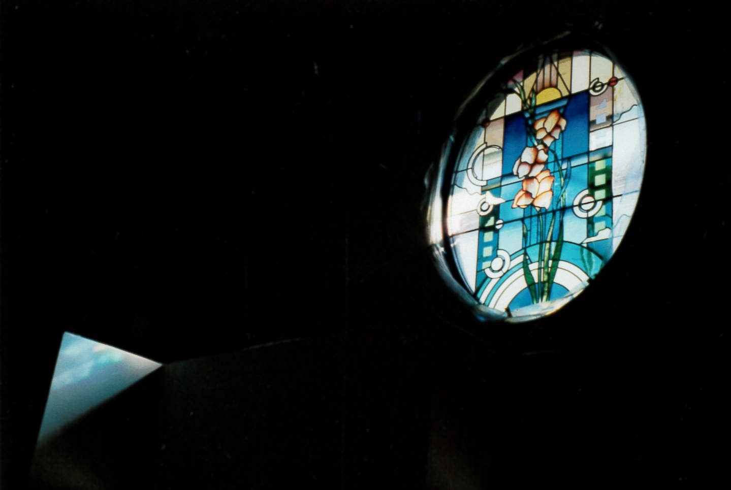 施主からスペインをイメージしてとの依頼。 設計者と初期の段階からデザインを打ち合わ せてステンドグラス以外にも、サイン 門扉 手すり(鍛造)ドア等デザインし依頼。