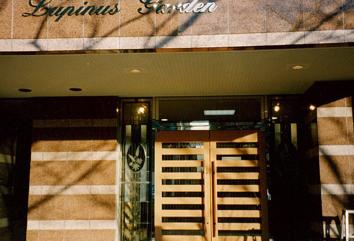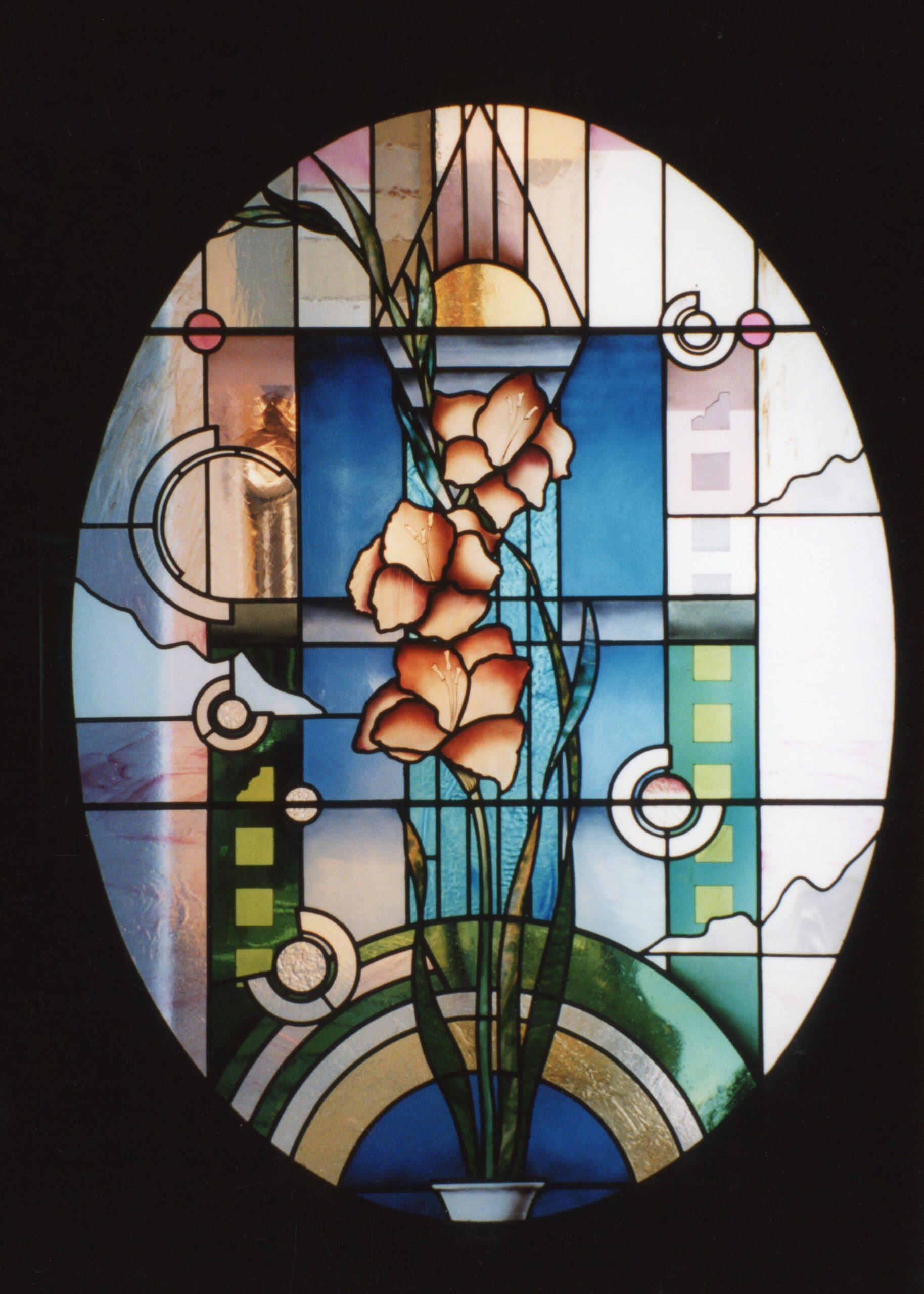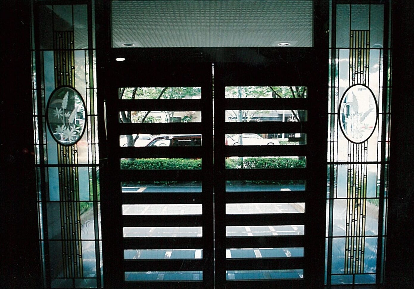 玄関そでに、マンションの名前であるルピナス のステンドグラスの依頼。 色彩をおさえ、ルピナスの花を楕円形の面取り ガラスにサンドブラストし組み込み落ち着いた ステンドグラスした。 W400mm・H1750mm 2枚